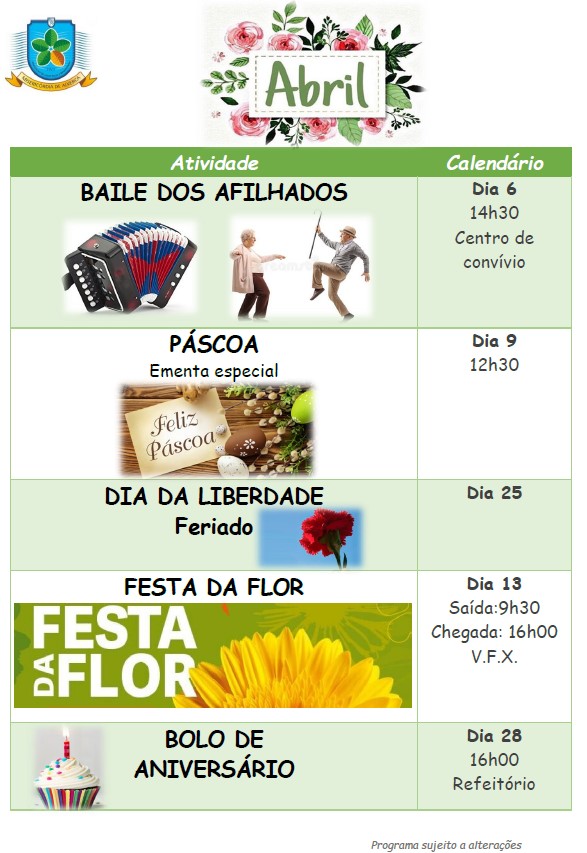 HomeAtividadesAniversários e Atividades :: Abril 2023 Aniversários e Atividades :: Abril 2023Atividades / 31 de Março, 2023