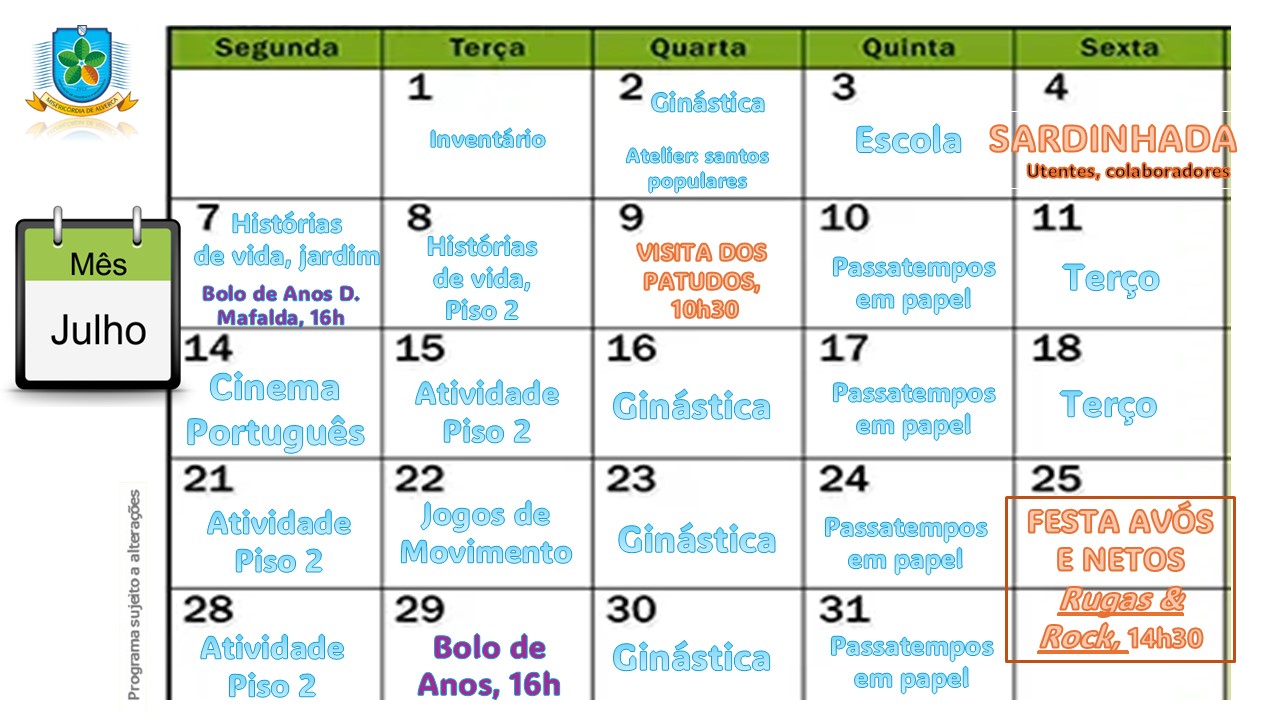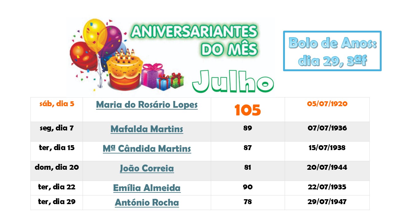 HomeAtividadesAtividades e Aniversários :: Julho 2025 Atividades e Aniversários :: Julho 2025Atividades / 1 de Julho, 2025 Parabéns aos nossos utentes de julho